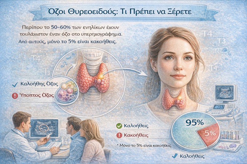 Ο θυρεοειδής είναι ένας μικρός αδένας σε σχήμα πεταλούδας, που βρίσκεται στη βάση του λαιμού. Παράγει ορμόνες (Τ3 και Τ4) οι οποίες ρυθμίζουν τον μεταβολισμό, τη θερμοκρασία του σώματος, τους παλμούς της καρδιάς και τη διάθεση. Όμως, κάποιες φορές μέσα στον αδένα σχηματίζονται μικρές διογκώσεις ή εξογκώματα — οι λεγόμενοι όζοι.