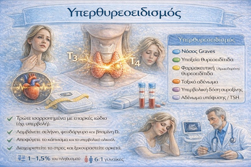 Όταν όλα είναι σε ισορροπία, νιώθουμε καλά. Όταν όμως έχουμε υπερβολική ποσότητα ορμονών, το σώμα «τρέχει» γρηγορότερα απ’ ό,τι πρέπει — και αυτό λέγεται υπερθυρεοειδισμός.