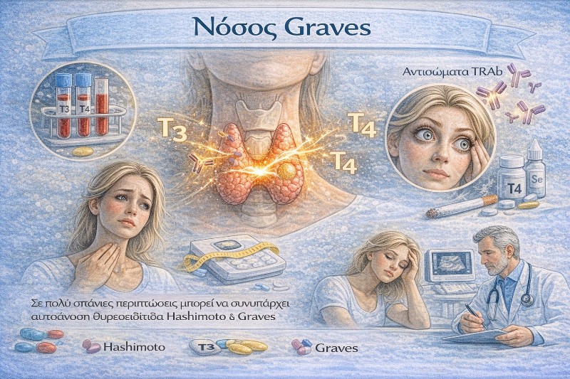 Η νόσος Graves είναι μια αυτοάνοση διαταραχή (το αντίθετο της νόσου Hashimoto) και αποτελεί την πιο συχνή αιτία υπερθυρεοειδισμού. Σε αυτήν την κατάσταση, το ανοσοποιητικό σύστημα παράγει αντισώματα (TRAb) που διεγείρουν υπερβολικά τον θυρεοειδή αδένα, οδηγώντας σε αυξημένη παραγωγή θυρεοειδικών ορμονών (Τ3 και Τ4). Το αποτέλεσμα είναι επιτάχυνση του μεταβολισμού, με συμπτώματα όπως ταχυκαρδία, απώλεια βάρους παρά την αυξημένη όρεξη, νευρικότητα, εφίδρωση, δυσανεξία στη ζέστη και τρόμο στα χέρια.