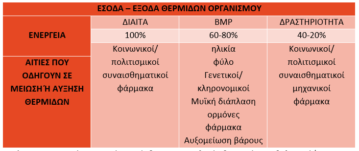 Αυτό που κυρίως καθορίζει πόσες θερμίδες χρειαζόμαστε είναι ο βασικός μας μεταβολισμός (εικόνα 1). Ο βασικός μεταβολισμός είναι πρακτικά η ενέργεια που χρειάζονται τα κύτταρα μας για να παραμείνουν στην ζωή. Ο βασικός μεταβολισμός εξαρτάται από πολλούς παράγοντες όπως είναι η ηλικία, η μυϊκή διάπλαση, το στρες, η συνύπαρξη παθήσεων (όπως ο υποθυρεοειδισμός, η υπερκορτιζολαιμία και η ινσουλινοαντίσταση), η λήψη φαρμάκων, το φύλο (οι άντρες έχουν υψηλότερο βασικό μεταβολισμό), γενετικούς/ κληρονομικούς παράγοντες και τέλος από τις αυξομειώσεις του βάρους.